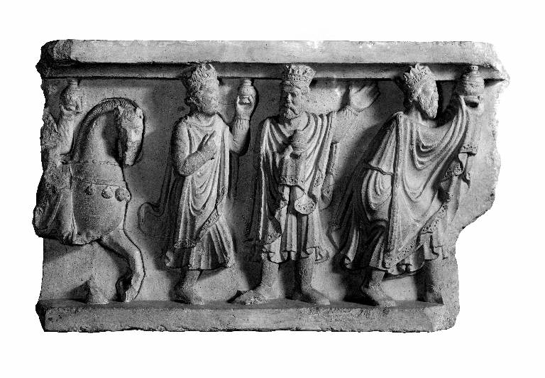 - NOTIZIE STORICO CRITICHE Protagonista della scultura romanica del nord-Italia, Benedetto Antelami (1150-1230 ca.) esponente di punta delle maestranze originarie della Valle d'Intelvi attive dal XII al XVI secolo tra Liguria, Emilia Romagna e Lombardia. Operoso dal 1178 nel cantiere del Duomo di Parma, dove dirige la costruzione del Battistero. Un notevole esempio dei raggiungimenti della scultura antelamica è il frammento di rilievo con il "Corteo dei Magi" scoperto nel 1943 sotto un pilastro del Duomo di Milano. Caratterizzata da forme eleganti, da una sciolta espressività dei personaggi e da una mirabile resa dei dettagli, l'opera risale ai decenni a cavallo del Duecento ed è ascrivibile ad un seguace dell'Antelami.