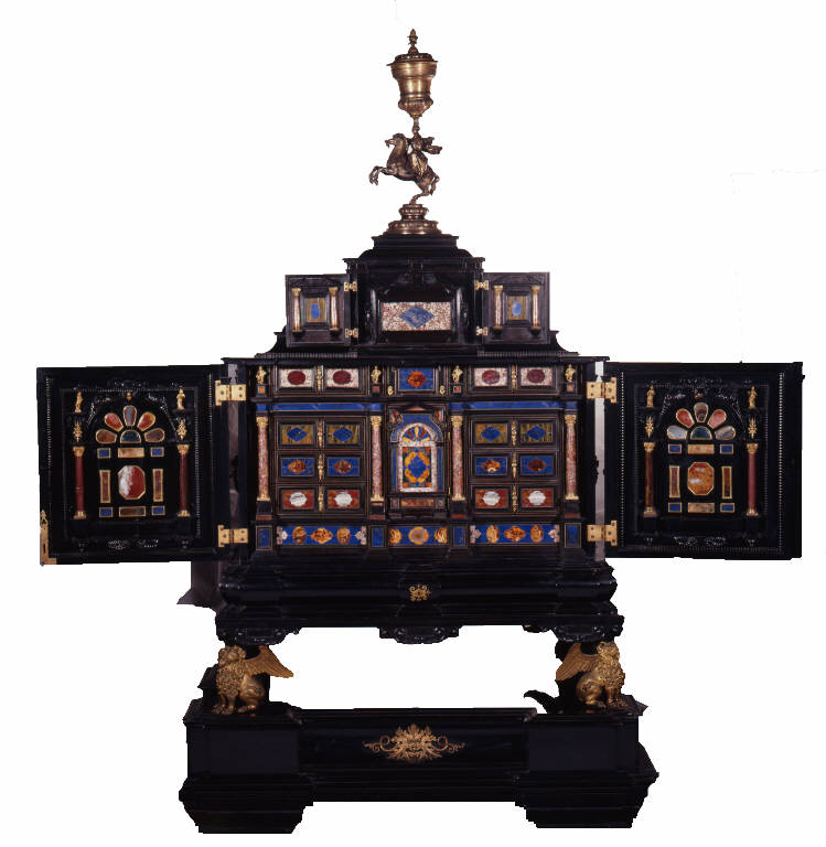 - NOTIZIE STORICO CRITICHE Lo stipo è stato fortemente rimaneggiato: il basamento in ebano nero è aggiunto da Giuseppe Speluzzi nel 1859 in occasione di un primo restauro dell'opera, e anche il calice posto sulla sommità è un'aggiunta dello stesso Speluzzi del 1881. Lo stipo è stato acquistato entro il 1849 presso Bartolomeo Merelli, negoziante. La tipologia dello stipo o monetario è di origine olandese e si diffonde in Italia, importata dalla Francia, in particolare in Toscana e Lombardia con un periodo di massima diffusione tra il 1550 e il 1650. Il "commesso" in pietre dure che lo decora è tipico di un laboratorio romano, che utilizzava pietre lucidate collocate secondo uno schema geometrico lineare; particolarmente preziose quelle della parte centrale, che ornano i numerosi piccoli cassetti.