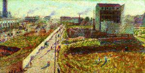 Dipinto ad olio su tela raffigurante una veduta della città di Milano, con le officine di Porta Romana. La tecnica è divisionista.