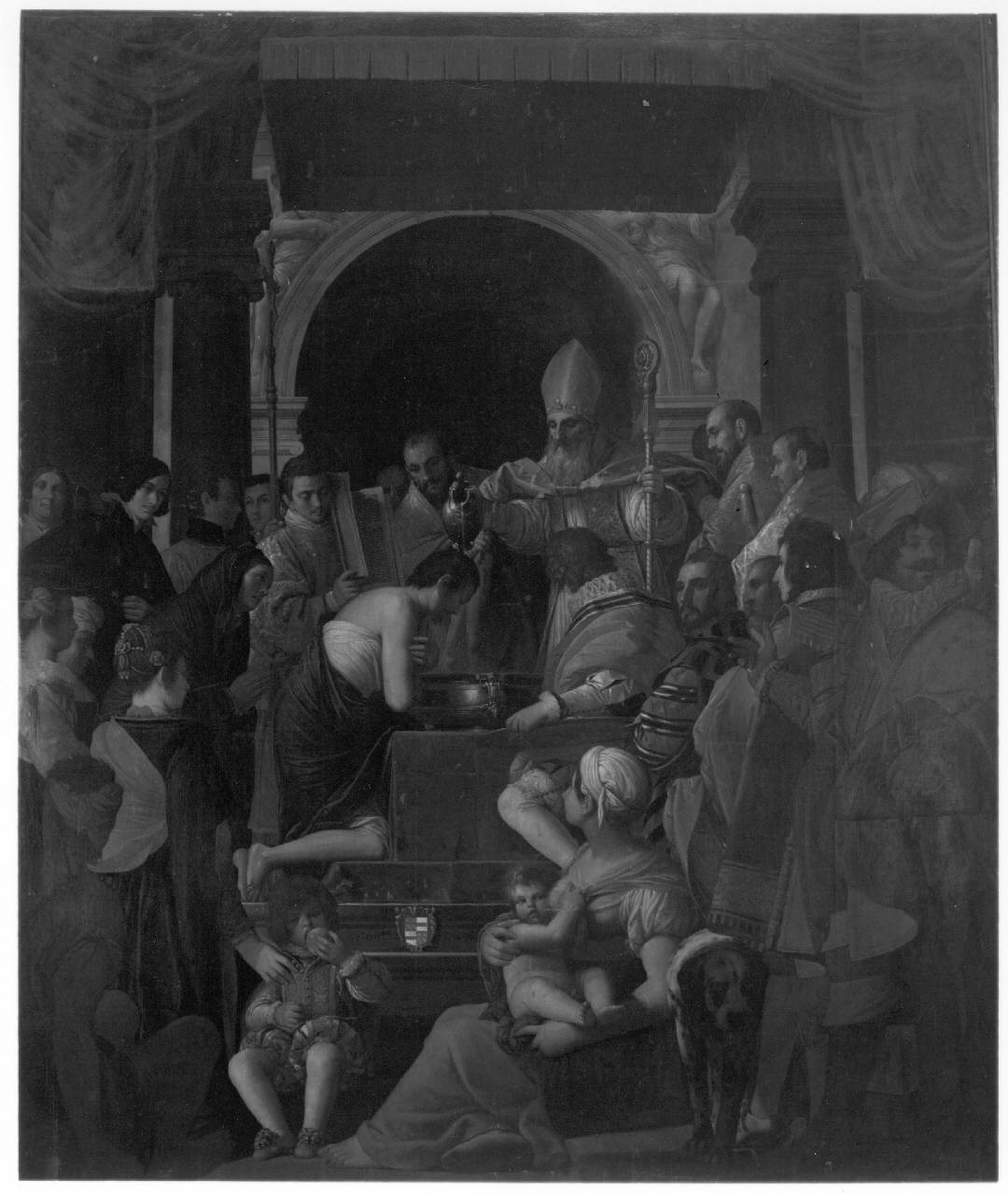 - NOTIZIE STORICO CRITICHE Il dipinto, opera chiave nel soggiorno cremasco di Pietro Damini (cfr. Ridolfi, 1634) che si data intorno al 1625 circa, fu commissionato da Ortensia Sanseverino Vimercati per la chiesa delle monache agostiniane a Crema. Precedendo di poco il Ritratto del teologo Serafino Facio (datato 1627), pure conservato in Accademia (P 388).\nL'iconografia del soggetto come Sant'Ambrogio battezza sant'Agostino appare più corretta rispetto al titolo generico, Sant'Agostino battezza un giovane, con il quale la tela era registrata negli inventari. Si suppone la provenienza dal complesso di Santa Monica a Crema, benchè non sia registrata nel Libro delle pitture di Giacomo Crespi. \n\nM. Albertario