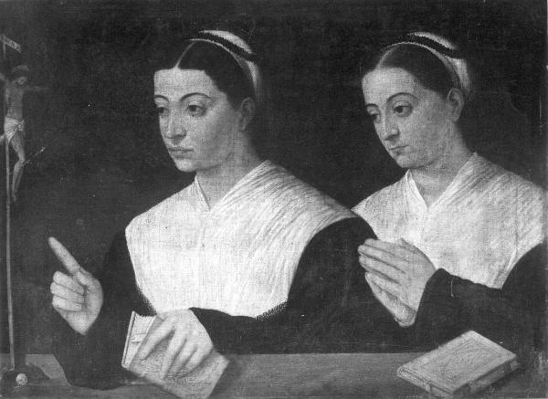 - NOTIZIE STORICO CRITICHE Le due donne possono essere identificate come appartenenti alla Compagnia delle dimesse di sant'Orsola, o Orsoline, fondata da Angela Merici (Brescia 1474-1540) intorno al 1535, approvata nel 1536. Lo conferma il confronto con un dipinto, ora distrutto, già conservato nella cripta della chiesa di Sant'Afra/Sant'Angela Merici a Brescia, dove le donne raccolte intorno alla santa indossano un abito con caratteristiche simili. Non si tratta di un abito monastico, ma semplicemente di un abito povero. Le dimesse conducevano una vita ritirata, si riunivano periodicamente per la comunione, seguivano la regola preparata dalla fondatrice nel 1535 ed erano soggette all'autorità dei vescovi locali, che riconoscevano come unici superiori. Il dipinto rappresenta il momento della professione religiosa: le due donne hanno il capo coronato di mirto e indicano il Crocefisso.\nMarco Albertario