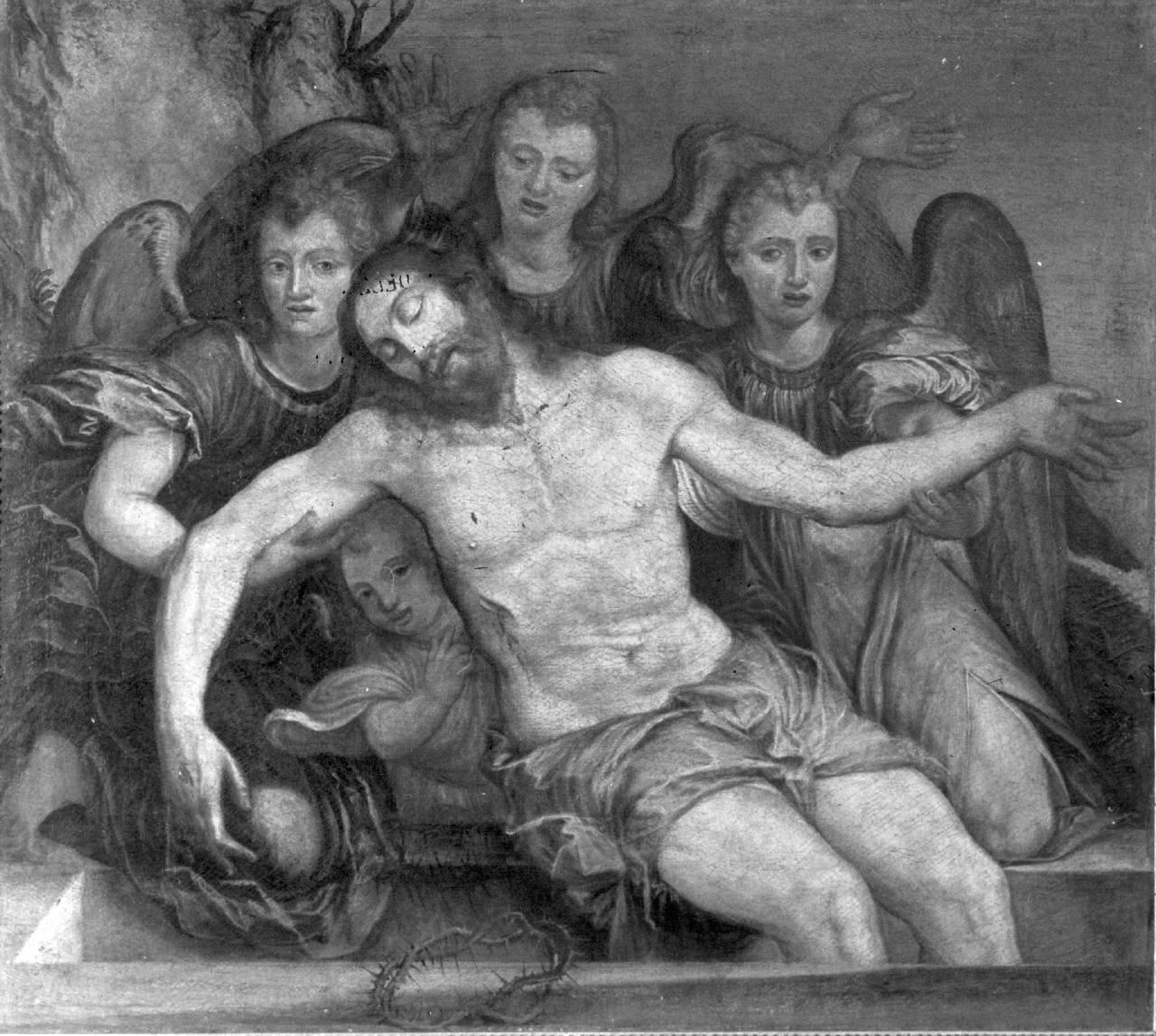 - NOTIZIE STORICO CRITICHE Acquisto del conte Luigi Tadini.\nS. Marinelli 2014 segnala, dietro suggerimento di L. Fabbri, che l'opera "varia di poco la parte della Pietà nella Pala [con Trinità e Santi] di Sant'Eufemia a Verona", da lui riferita alla prima attività di Ligozzi. \n\nLa questione va probabilmente ulteriormente approfondita: infatti, il dipinto di Lovere è simile da un olio su tela di identico soggetto, ampliato (misura attualmente 170x160 cm) e inserito in una cornice in stucco in una chiesa della Diocesi di Verona (ricavo l'informazione dal sito dedicato ai Beni culturali ecclesiastici, Inventario dei beni storici e artistici della Diocesi di Verona, dove l'ubicazione non è indicata). \nInoltre, la figura del Cristo è ripresa in modo molto più fedele in una seconda tela che mostra Cristo in pietà con la Vergine e due angeli, attualmente (2015) conservata presso la Galleria Michelangelo, Bergamo (esposta in occasione della mostra allestita in Galleria in concomitanza con l'esposizione dedicata a Palma il Vecchio; olio su tela, 73x83 cm). La tela si può vedere riprodotta in Antichi Maestri 1986\nMarco Albertario