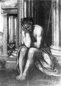 Cristo seduto ai piedi di una struttura architettonica a colonne; sullo sfondo, pentimento di Pietro.