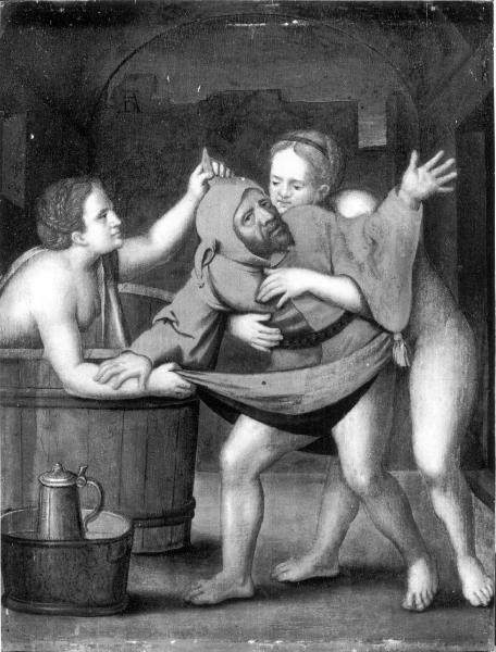 - NOTIZIE STORICO CRITICHE Il dipinto deriva da una celebre incisione di Barthel Beham, conclusa dal fratello Hans Sebald che sigla e data il foglio 1541. Considerato dal conte Luigi Tadini come opera di Albrecht Durer per la presenza del monogramma AD apposto su un angolo della tavola.\nM. Albertario