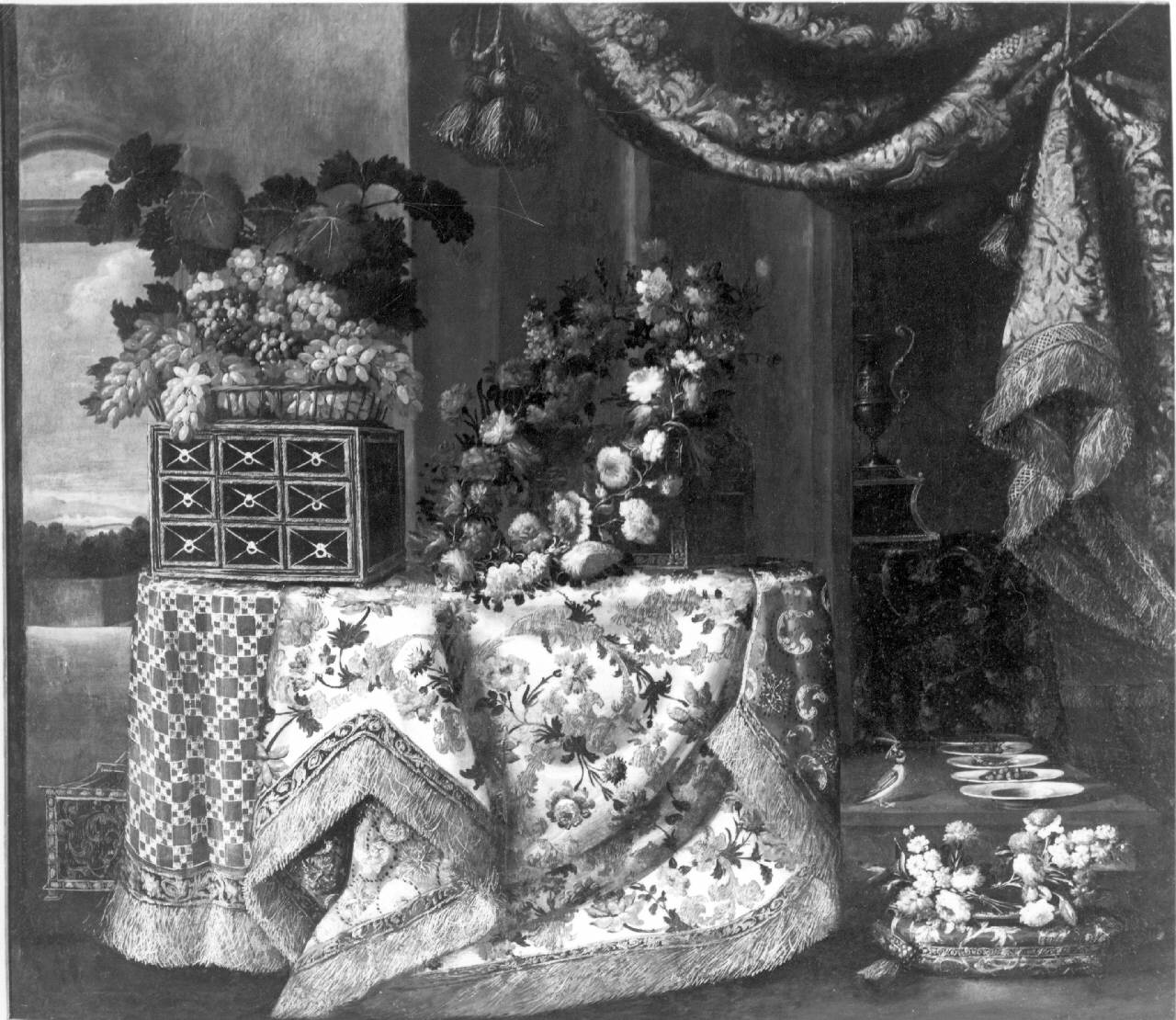- NOTIZIE STORICO CRITICHE Le tre tele (cfr. P 327, P 328, P 329) sono documentate nella guida (Tadini 1828, Tadini 1837) come "Tre quadri rappresentanti fiori e frutti del prete Evarisco Barcellis di Bergamo", segno che dell'autore si era persa l'identità, ed era stato assimilato al più celebre Evaristo Baschenis, per la verità mai identificato come tale, tanto che il riferimento al "Barcellis" è riproposto ancora in Catalogo 1903, e nella trattazione su Evaristo Baschenis di Rosci (1985, p. 95 n. 169) le tre opere riferite a Baschenis sono date per disperse.\nSi deve a Scalzi 1929 tanto la corretta identificazione di Barcellis con Baschenis, quando il riferimento a Giacomo Desti detto il Cardellino, assumendo come motivo firma l'uccello presente nelle tre tele. In questo modo le tele sono successivamente indicate (Scalzi 1969), fino alla corretta individuazione dell'autore, Antonio Gianlisi junior da parte di Salerno (1984), condivisa successivamente da Morandotti (1989) e resa pubblica in occasione della presentazione di una delle tre alla mostra dedicata al Settecento Lombardo (Zanardi 1991). Il riferimento era prontamente accolto da Scalzi 1991 (il nome "Nicola" è evidentemente un refuso). Intanto le tre opere, con una proposta di datazione nel primo quarto del Settecento, erano correttamente inquadrate nel percorso dell'autore (Bocchi, Bocchi 1998) sul quale si susseguivano gli accertamenti documentari (Carubelli 2000). \nLa provenienza da Crema e la pertinenza all'arredo di Palazzo Tadini, probabilmente insieme alle due tele di Antonio Gianlisi senior (P 476 e P 477) troverebbero conferma nella presenza dello stemma Tadini (cfr. P 329). \nM. Albertario
