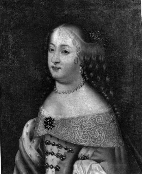 - NOTIZIE STORICO CRITICHE Secondo la ricostruzione proposta da G.A. Scalzi (in Pinacoteca 1966) i sei ritratti in esame (P 468-P 473) decoravano in origine le sale dell'appartamento del conte Luigi Tadini, e quindi pervennero all'Accademia con il Legato del 1829. Nel 1919 furono donati al conte Roberto Vimercati Sanseverino Tadini a titolo di gratitudine per la rinuncia al diritto di abitazione nell'appartamento del piano nobile (seguì l'asta con la dispersione degli arredi). Lo stesso Vimercati Sanseverino li restituì all'Accademia nel 1946.\nIl ritratto in esame mostra Maria Teresa d'Asburgo, nota anche come Maria Teresa d'Austria (1638-1683), moglie di Luigi XIV, regina di Francia dal 1659, data da assumere come termine post-quem per il ritratto (cfr. le considerazioni sul Ritratto di Luigi XIV, AT P 470).\nLe tele sono provviste di ricche cornici in legno intagliato, dorato e dipinto, che collegano i ritratti a coppie (P 472 e P 468; P 470 e P 471; P 469-P 473).\nMarco Albertario