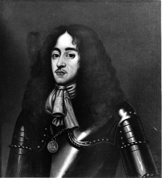 - NOTIZIE STORICO CRITICHE Secondo la ricostruzione proposta da G.A. Scalzi (in Pinacoteca 1966) i sei ritratti in esame (P 468-P 473) decoravano in origine le sale dell'appartamento del conte Luigi Tadini, e quindi pervennero all'Accademia con il Legato del 1829. Nel 1919 furono donati al conte Roberto Vimercati Sanseverino Tadini a titolo di gratitudine per la rinuncia al diritto di abitazione nell'appartamento del piano nobile (seguì l'asta con la dispersione degli arredi). Lo stesso conte li restituì all'Accademia nel 1946. \nIl dipinto rappresenta Carlo II Stuart (1630-1685), re d'Inghilterra dal 1649 o dal 1660 al 1685. Il ritratto va letto in coppia con quello del fratello e successore Giacomo II Stuart (P 469); entramdi sono qualificati con un medaglione con San Giorgio e il drago, decisamente meglio leggibile nell'esemplare in esame. \nLe tele sono provviste di ricche cornici in legno intagliato, dorato e dipinto, che collegano i ritratti a coppie (P 472 e P 468; P 470 e P 471; P 469-P 473).\nMarco Albertario