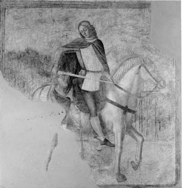 - NOTIZIE STORICO CRITICHE Riassumo in scheda le vicende relative all'affresco in esame e ad altri due (P 525, P 526, P 527), che hanno la stessa provenienza (chiesa di San Martino), dalle annotazioni di don Gino Angelico Scalzi sul catalogo della Pinacoteca. \nGià sulla facciata della ex cappella di San Martino, via Santa Maria, già di proprietà delle monache clarisse di Lovere, venduta all'impresario Giuseppe Pelli di Iseo. Quest'ultimo ha finanziato il distacco di questo affresco e dei due seguenti (P 526, P 527). Il distacco è avvenuto previa autorizzazione del Ministero P.I. in data 11 gennaio 1974, n. 9893, comunicata dalla Soprintendenza. L'intervento è stato eseguito dal restauratore bergamasco Giuseppe Arrigoni, e seguito dal restauro nel 1975.\nMarco Albertario