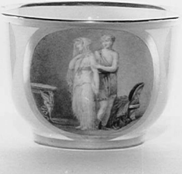 tazza a pareti a linee curve e un ansa, porcellana bianca con bordi oro recante figura di uomo e donna abbigliati all'antica, in monocromo (Nozze di Alessandro e Rossane)