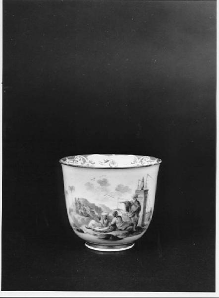 - NOTIZIE STORICO CRITICHE Le sei tazzine da caffè con relativi piattini (H 50 - H 55) furono probabilmente acquistati dal conte Luigi Tadini nel corso del suo soggiorno a Napoli (ultimo decennio del XVIII secolo: per un approfondimento della cronologia, cfr. Albertario 2012) e dovevano costituire una rarità sul mercato, avendo la fabbrica chiuso nel 1759. \nI sei pezzi, caratterizzati dalla forma piuttosto ampia della tazza e dal manico a spigoli vivi (ispirato ai primi modelli barocchi di Meissen) sono stati segnalati da Alessandra Mottola Molfino, che ha suggerito un'attribuzione al pittore Giovanni Caselli (1698-1752), attivo a Capodimonte dal 1744 al 1752 (A. Mottola Molfino 1977, figg. 122-129). La segnalazione è stata successivamente accolta da S. Musella Guida (in Le porcellane 1986, pp. 246-247 n. 189) che ha confrontato le figurine animate da pose dinamiche ed espressive di una tabacchiera di Capodimonte decorata dalla storia di Giuditta e Oloferne (Napoli, Museo Duca di Martina), con "le figurazioni storiche del servizio di tazze della Galleria Tadini di Lovere", evidenziando l'importanza del genere "istoriato", come tra i primi che Caselli introdusse nella sua produzione per Carlo III , e poi da M. Confalone ( in Sovrane fragilità 2007, pp. 111-113 n. 45). \nRiprendendo da ultimo l'esame della serie, A. Pacia (2010) ha innanzitutto sottolineato, riprendendo osservazioni di Stazzi 1972, pp. 158-159, come l'assenza di dati certi sulla manifattura di Capodimonte renda difficile l'individuazione di altre personalità autonome rispetto a quella di Caselli, che risulta quindi la meglio nota, sia pur inserita in un generico discorso di gusto (per il quale cfr. Caròla-Perrotti 1986). Pur condividendo, per le caratteristiche tecniche e stilistiche e per il gusto strettamente legato al rococò francese, il riferimento al direttore della fabbrica, ha sottolineato come la radicale novità nell'impaginazione delle scene e la vivacità delle svelte figurine, che sembrano staccarsi per la loro vivacità alla formulazione ripetitiva della produzione nota della manifattura, faccia pensare alla puntuale ripresa di un repertorio di incisioni. Se fosse confermata l'attribuzione a Caselli, si tratterebbe di un episodio di radicale novità rispetto alla produzione nota del decoratore. \n\nM. Albertario