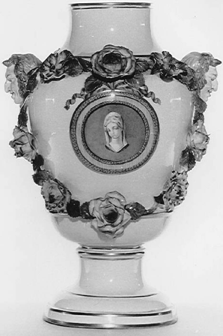 Vaso in porcellana bianca a forma di anforetta con festoni di roselline in tutto rilievo e due mascheroni che fungono da ansa. Sul corpo del vaso, entro medaglioni, busti di figure femminili su sfondo rosa opaco.