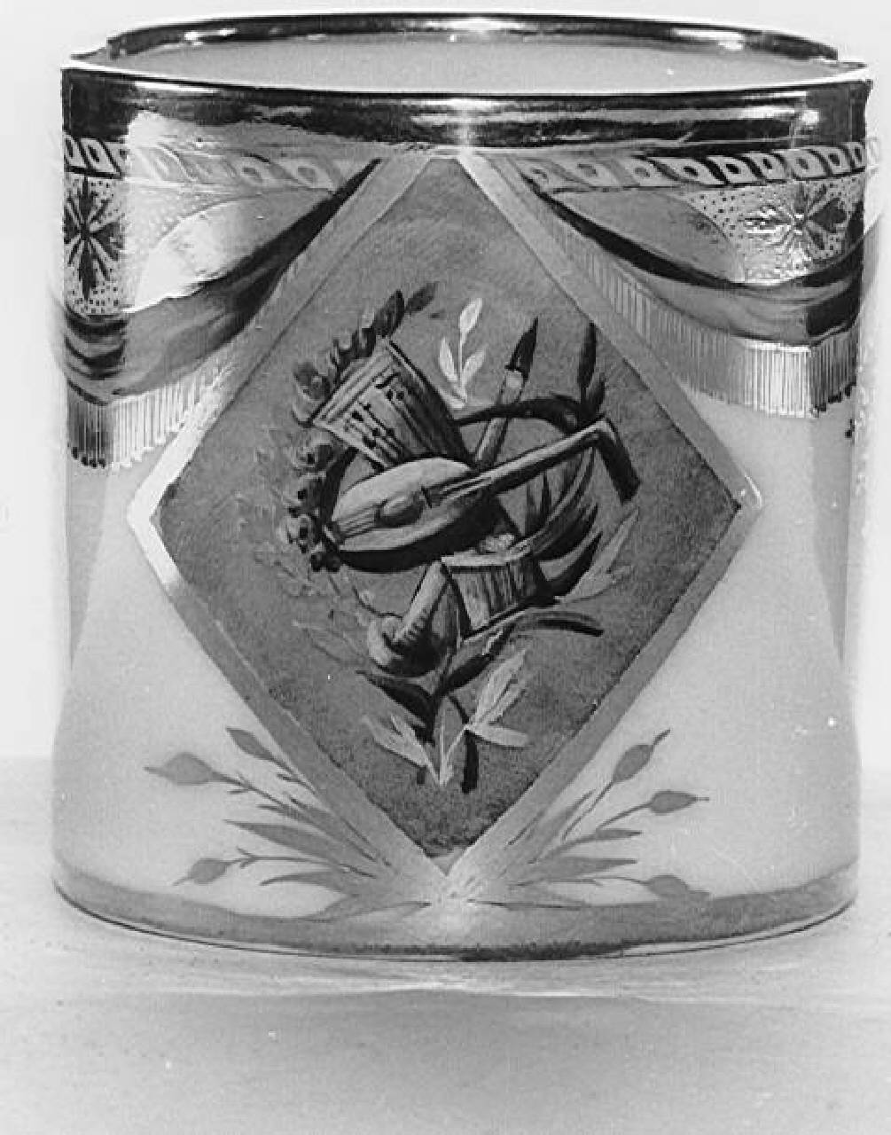 Tazzina à litron con nautra morta di strumenti musicali a monocromo entro rombi; decorazione a festoni e strumenti musicali entro rombi