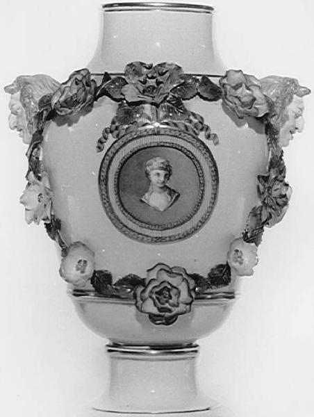 Vaso in porcellana bianca a forma di anforetta con festoni di roselline in tutto rilievo e due mascheroni che fungono da ansa. Sul corpo del vaso, entro medaglioni, busti di figure femminili su sfondo rosa opaco.