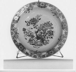 Piatto in porcellana decorato con motivi benaugurali a smalti nella paletta della famiglia rosa realizzati sopra coperta. Sul fondo, al centro, sono raffigurati una grande peonia arborea, un cervo sopra un tavolino e una coppa contenente alcuni frutti, fra i quali si distinguono il cedro"mano di buddha", il melograno e il melone. La tesa è decorata a fiorami e a motivi a stendardo e fitomorfi. Prevale il colore rosa sfumato. Gi altri colori sono il rosa chiaro, il verde scuro e il verde chiaro, il blu, l'arancione e il marrone con ritocchi in oro.