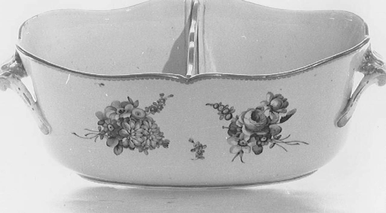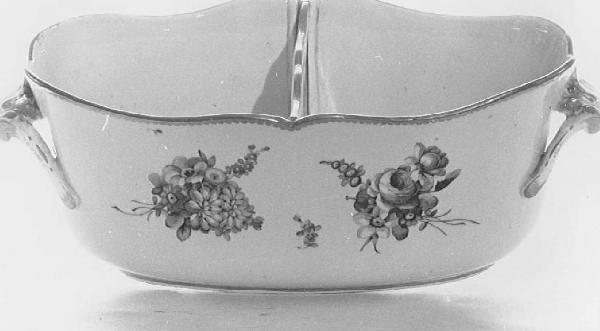 Pianta quasi ovale con manici a foglie sui due lati. All'interno paratia con fori, posta a metà. Dipinti a mazzetti di fiori "au naturel", con bordo sagomato e orlo dorato e decorazione a dente di lupo.