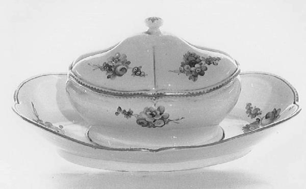 Le due salsiere ovali ono costituite da piatto con recipiente ovale formanti un unico pezzo e completato da un coperchio terminante con roselline. Dipinte a mazzetti di fiori "au naturel" con bordo dorato e decorazione a dente di lupo.