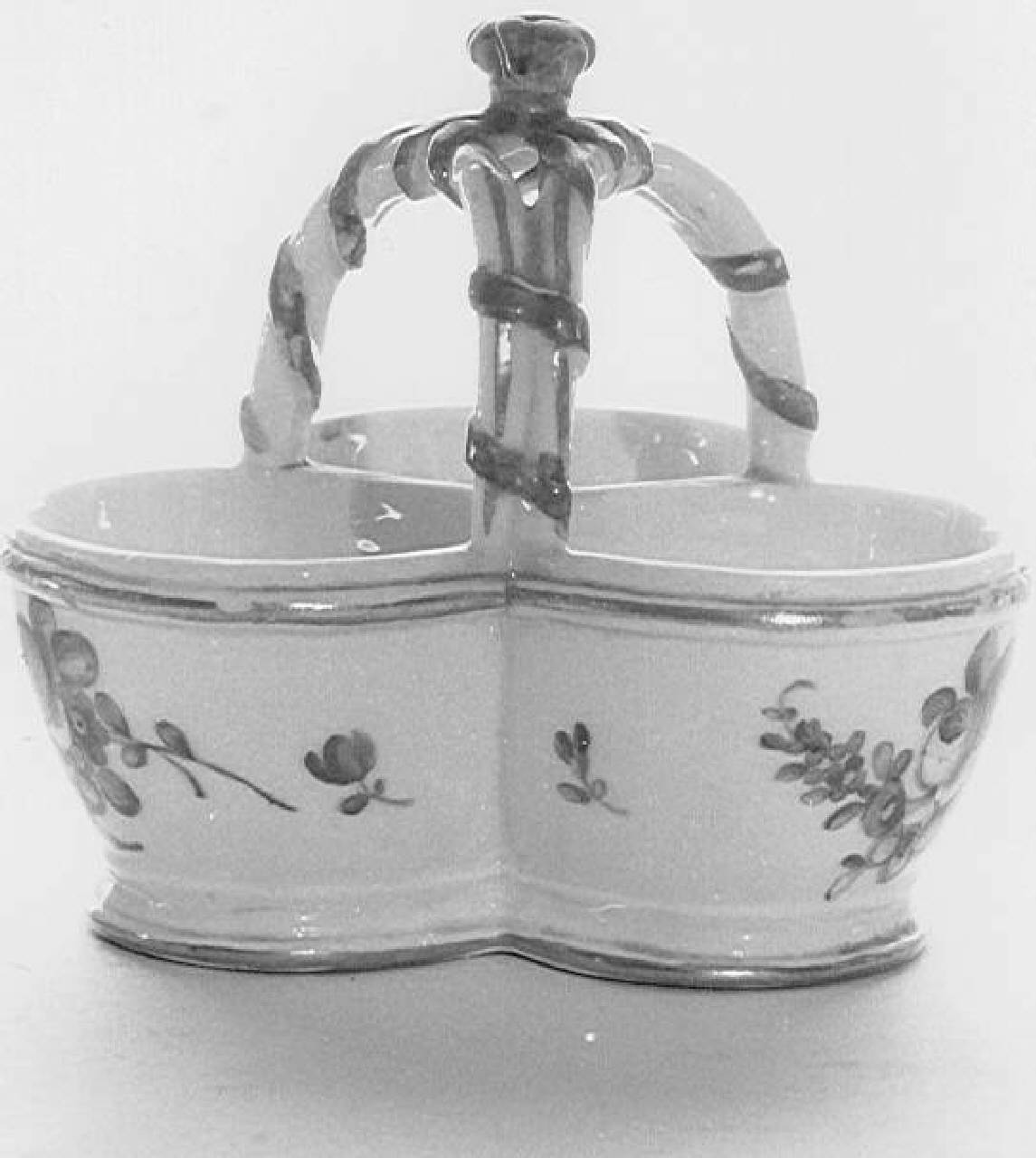 Saliera costituita da 3 piccole ciotole unite informa di cestello e collegate da manico, dipinte a fiorellini variopinti.