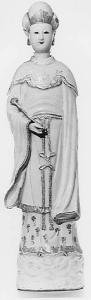 Statuetta in ceramica bianca invetriata o porcellana morbida raffigurante una dama con grande acconciatura, ricchi paludamenti e uno scettro in mano, stante su un basamento a forma di nuvole. La statuetta è stata dipinta con smalti rosso nero e oro, forse a crudo. L'invetriatura, color panna, si è crettata col tempo.
