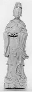 - NOTIZIE STORICO CRITICHE L'immagine di questa statuetta fa riferimento a una divinità femminile cinese. Il frutto tenuto fra le mani, apparentemente una pesca, caratterizza diverse divinità del taoismo e del buddismo. Solitamente associata alla pesca è la dea taoista Ma gu, che regge fra le mani sia il frutto sia le foglie, come in questo caso, divenendo simbolo di longevità. La veste indossata dalla dama è tuttavia atipica, mentre l'uso del velo si ritrova più spesso associato alla figura buddista di Guanyin (il bodhisattva Avalokitesvara), così come i due nastri che ricadono sulle spalle. La porcellana bianca, dura e sonora di questa statuina è tipica delle produzioni delle fornaci di Dehua, che producevano in grande quantità porcellane d'esportazione per l'Europa creando forme che non sempre erano pienamente coerenti con l'iconografia tradizionale locale. Talvolta infatti le immagini locali erano modificate dall'artigiano cinese per adattarsi al gusto straniero.