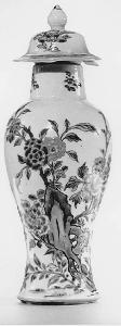 Coppia di vasetti in porcellana a balaustra con piede circolare espanso, spalla alta e breve e stretto collo cilindrico, sormontato da un coperchio a forma di campana con tesa spiovente e pomello centrale a bocciolo di loto. La decorazione è realizzata nella paletta della famiglia rosa (yangcai/ fencai), con smalti sopra coperta, a fiori arborei di peonia, rosa, lillà, magnolia, melograno, margherita e altri tipi ti fiore, e da una roccia tradizionalmente forata (hu). Si distinguono i colori blu, rosa, verde pisello, verde smeraldo, rosa e giallo.