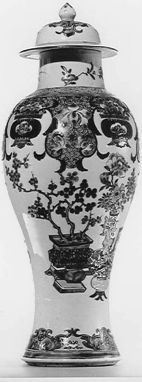 Vasetto in porcellana a balaustra con piede circolare espanso, spalla alta e breve e stretto collo cilindrico sormontato da un coperchio a forma di campana con tesa spiovente e pomello centrale a bocciolo di loto. La decorazione è realizzata nella paletta della famiglia rosa (yangcai/ fencai), con smalti sopra coperta, nei colori blu, turchese, rosa pastello, rosa di cassio, verde smeraldo, blu e marrone e oro con figure di oggetti simbolici fra i quali piante in vaso, vasi con fiori, tavolini, rotoli dipinti, schermi dipinti ecc. La spalla è decorata con una bordura marrone modanata entro la quale si insinuano quattro vasi con fiori. Si distinguono peonie, aster, e numerosi altri fiori.
