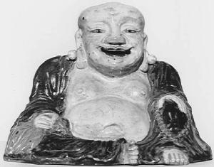 Statuetta in ceramica invetriata raffigurante Budai, tipicamente rappresentato come un monaco dal ventre prominente, scoperto, la testa rasata, le lunghe orecchie e il grande sorriso beato, mentre sta seduto con una gamba alzata sopra la quale poggia la mano sinistra che regge un piccolo rosario, mentre la destra è tenuta vicino al grembo e regge un sacco. Il biscotto si presenta morbido e marrone, mentre l'invetriatura è color panna per la pelle, marrone per la veste monacale e verde per il sacco. La statuetta è forata sulla schiena. Il fondo, non invetriato, è liscio e presenta tre scalfitture sul un lato. Alle orecchie sono state aggiunte in Europa due gusci di perla, ora in frantumi.