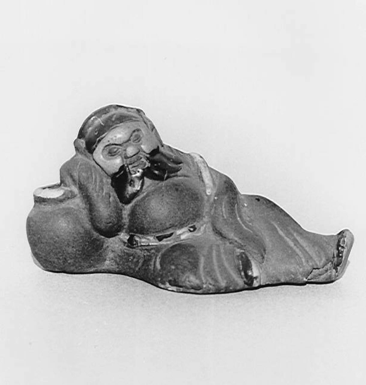 Statuina in ceramica dal biscotto marrone scuro, raffigurante il poeta Li Bai, raffigurato sdraiato e dormiente, appoggiato su una giara per liquori. Il viso è smaltato color panna rosato e la barba è dipinta in nero.