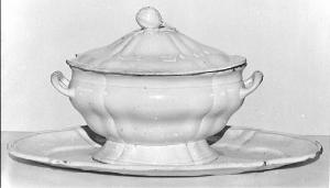 - NOTIZIE STORICO CRITICHE Le terraglie della Collezione Tadini non presentano alcuna marca e pertanto non è possibile assegnarle con sicurezza ad una manifattura specifica. Una tradizione orale vuole che tali pezzi siano stati realizzati dalla manifattura Bottaini di Sovere, forse da identificare con la "buona fabbrica di terraglia già segnalata a Sovere da Maironi da Ponte (Maironi da Ponte 1820, p. 119). La manifattura, di fondazione settecentesca, si trovava all'interno di uno stabile attualmente inglobato in palazzo Venturi, in contrada al Ponte. Per la produzione venivano utilizzate le marne\nargillose del deposito lacustre di Pianico. Nel 1843 Nicola Bottaini cedette la fabbrica con la relativa licenza a Modesto Picozzi che, successivamente, fece confluire la produzione di Sovere all'interno di quella della più grande Manifattura Richard di Milano (Stabilimento di San Cristoforo).\nL'opera in esame potrebbe essere identificata con una delle quattro zuppiere menzionate nell'Inventario Giudiziale. Benché il nome Bottaini non sia registrato in tale documento, pare plausibile che il conte potesse possedere un servizio prodotto da una fabbrica locale che imitava le forme, secondo una moda diffusa, delle terraglie "all'uso inglese".\nTra le terraglie Tadini è possibile effettuare degli accostamenti: l'opera in esame, ad esempio, pare stilisticamente avvicinabile al servizio per olio e aceto (inv. H151), al piatto da portata ovale (H 153) e a due piattini (H541-H542).\nIlaria De Palma