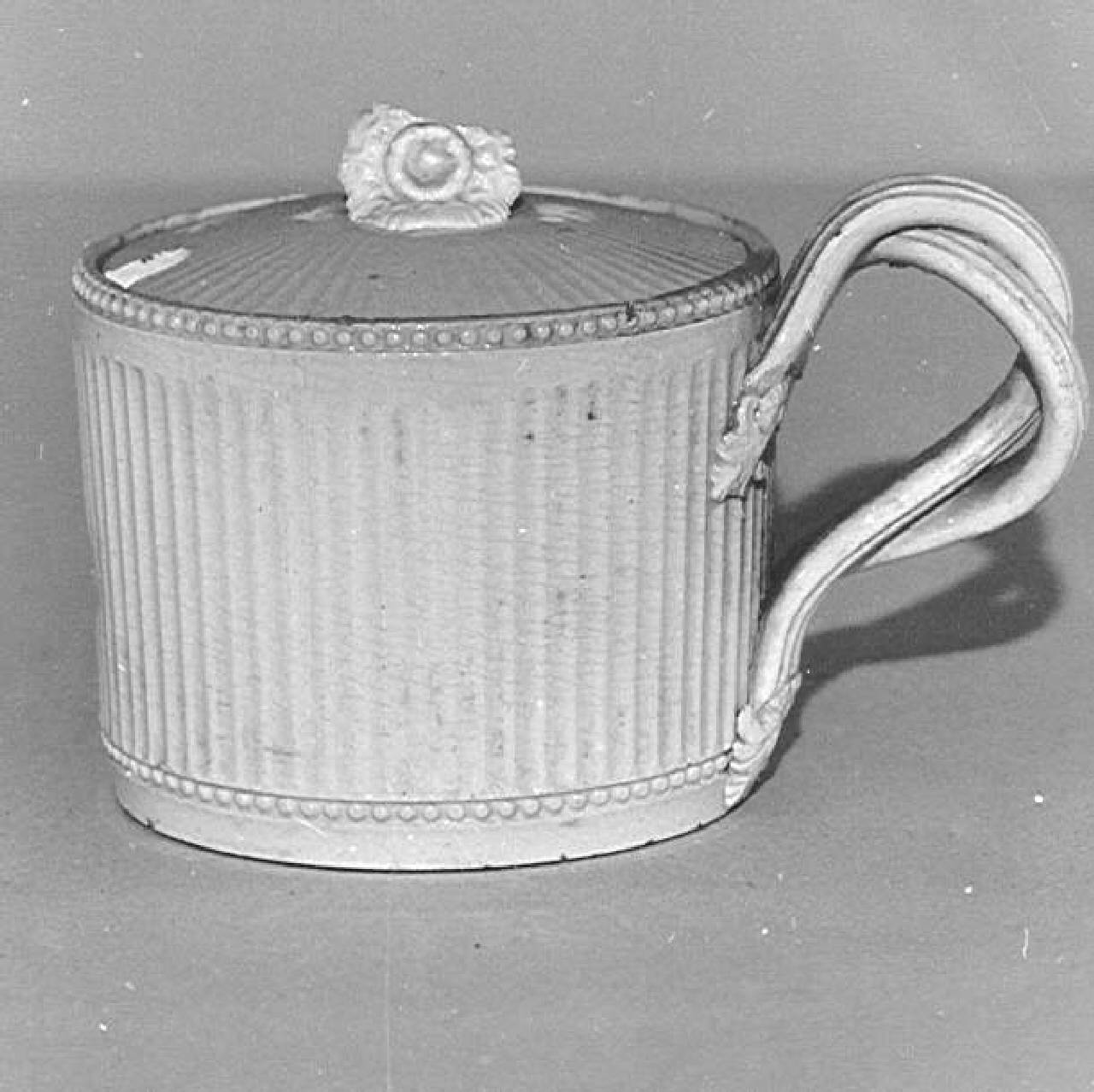 Tazze da crema a forma cilindrica. Corpo e coperchio scanalati. Ansa a forma di nastri incrociati. Impugnatura del coperchio a forma di fiore.