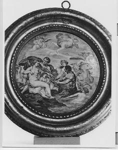 Tondo raffigurante Anfitrite ignuda seduta in riva al mare in atto di ricevere doni offerti da divinità marine poste innanzi. Dietro Anfitrite, giovane con manto azzurro; in cielo, amorini svolazzanti.\nIl tondo è inserito in una cornice intagliata e dorata.