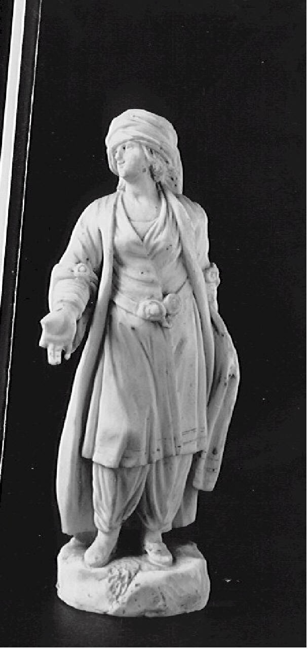 - NOTIZIE STORICO CRITICHE Riferita all'ambito veneto nella precedente catalogazione (nella mostra dedicata all'antica ceramica di Este 1960, è schedata come prodotto della Fabbrica Franchini su stampo Varion), la Figura di orientale è stata identificata da chi scrive come prodotto della Reale Fabbrica di Porcellana di Napoli (per quanto non marcata) sulla base del confronto con una Coppia di figure in abiti orientali conservati presso la raccolta Comparini di Napoli (cfr: Carola Perrotti 1986, p. 537 scheda 516).\nLa produzione risulta ancora in gran parte da censire, ma il rapporto con l'esemplare napoletano sembpbra veramente stringente nei dettagli del costume, mentre si presentano leggere variazioni nella posa.\nMarco Albertario