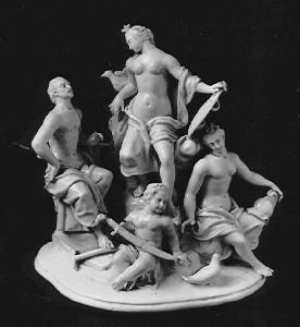 - NOTIZIE STORICO CRITICHE Il gruppo e quello gemello (H 31) sono segnalati da A. Mottola Molfino (1976) come opera di collaborazione tra Giovan Pietro Varion e Gerolamo Franchini; per queste ragioni è opportuno stringere la cronologia, come nota G. Ericani (1990) agli anni 1778-1781, sulla base della data di morte di Varion, sia pur ammettendo che le figurine siano rimaste in produzione nella manifattura Franchini.\nNon si conosce un esemplare analogo a quello loverese perché quello di Amburgo, Museum fur Kunst und Gewerbe segnalato da Baroni (1935), del Victoria and Albert Museum (segnalato da Mottola Molfino 1976, fig. 334) e quello di Cà Rezzonico (Ericani 1990, p. 392) riducono il gruppo a tre figure, Venere, Vulcano e Cupido.\nM. Albertario