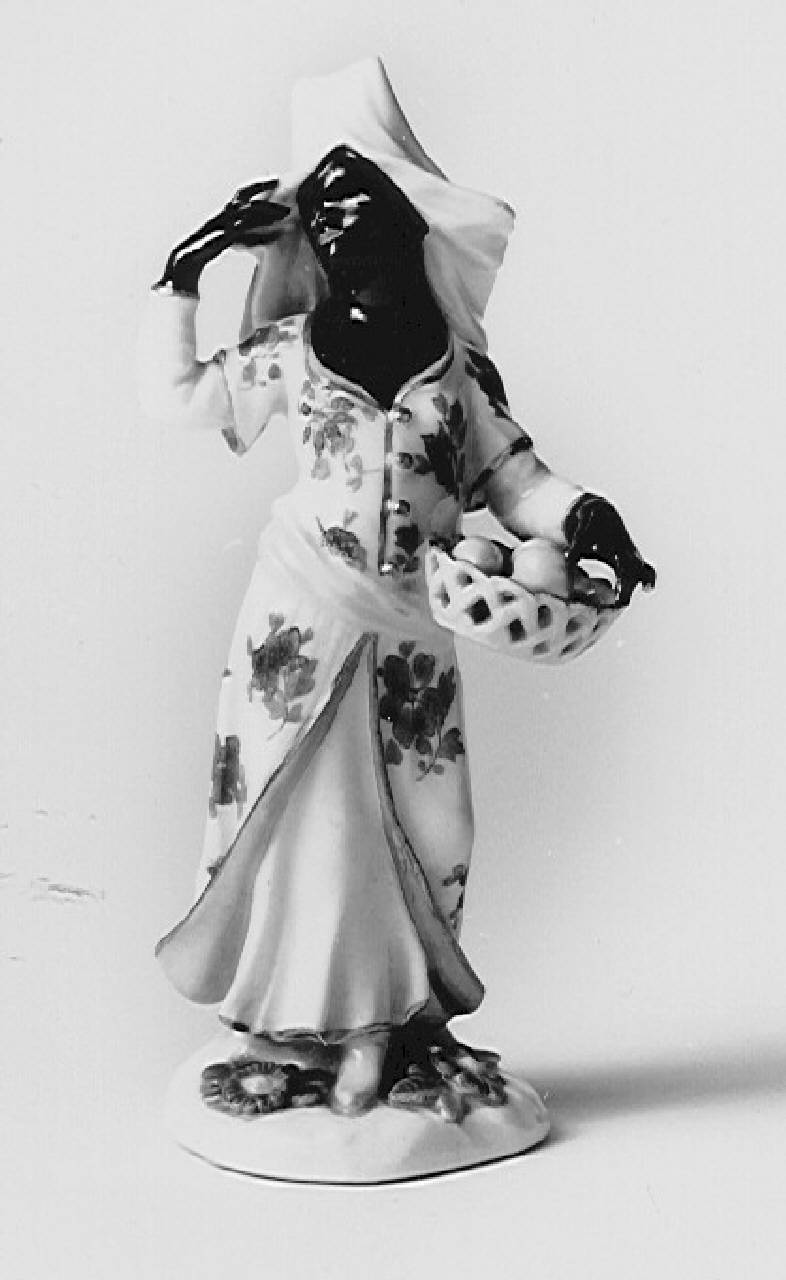 Donna nera con canestro di frutta. Indossa una veste bianca con sopraveste pure bianca a fiori azzurri e dorature sui bordi. In testa ha un alto velo bianco.