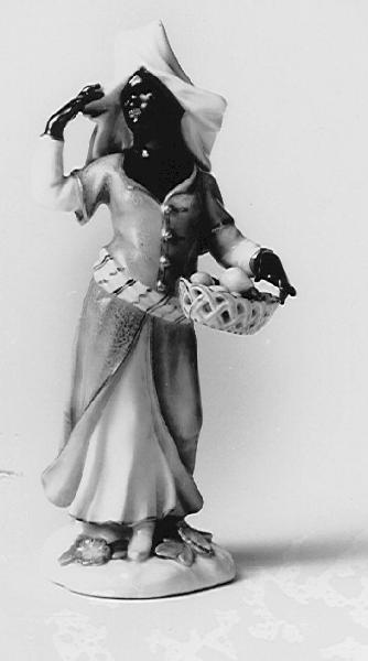 Donna nera con canestro di frutta. Indossa una veste bianca e sopraveste verde a fiori. In testa ha un alto velo bianco.