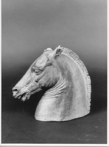- NOTIZIE STORICO CRITICHE La terracotta riproduce la celebre protome equina già conservata nel cortile di Palazzo Carafa di Columbrano, modellata da Donatello, donata da Lorenzo il Magnifico a Diomede Carafa, conte di Maddaloni, e successivamente ritenuta originale classico. Il riferimento a Donatello è ormai confermato (cfr. Caglioti 2004), \nLa raccolta di antichità nel cortile del palazzo di via San Biagio dei Librai ne fece una delle tappe dei visitatori del Grand Tour, anche per l'indubbio fascino della testa equina, che fu successivamente donata alle collezioni del Museo Archeologico Nazionale nel 1809. E' probabile che al soggiorno del conte Luigi Tadini a Napoli (ultimo decennio del XVIII secolo: Albertario 2011; Albertario 2012) si possa quindi far risalire l'acquisto. \nIl cartiglio già esistente sotto l'oggetto, e parzialmente trascritto da don Gino Angelico Scalzi nel Catalogo degli oggetti esposti in vetrine del 1937-1966, consente il riferimento a Carlo Amatucci, attivo fino al 1809, che fu tra i protagonisti della stagione del presepe napoletano ripresa con Carlo III e Ferdinando I, specializzandosi nella modellazione di animali e in particolare dei cavalli, resi con grande eleganza neoclassica.\nIl sensibile modellato della testa suggerisce quindi una mediazione tra le fonti (la Protome Carafa, già ritenuta originale classico) e le sculture da presepe. \nMarco Albertario