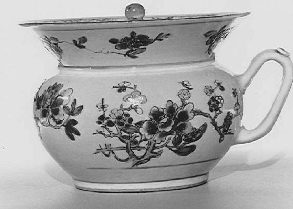 - NOTIZIE STORICO CRITICHE Il vaso da notte con coperchio presenta la tipica decorazione ad imitazione delle porcellane orientali con fiori carnosi e rami su fondo bianco.\nEssendo tale motivo decorativo molto comune e in assenza di marca non è possibile attribuire con certazza il vaso da notte a nessuna manifattura in particolare, né può essere confermata la precedente attrbuzione alla Manifattura di Vienna.\nIlaria De Palma