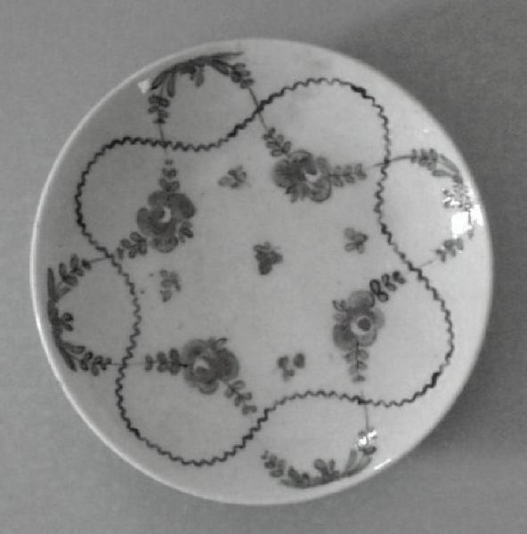 - NOTIZIE STORICO CRITICHE Il motivo decorativo, molto diffuso, rende l'attribuzione incerta. Tuttavia si propone un accostamento a una tazza con piattino - conservata presso le Raccolte d'Arte Applicata del Castello Sforzesco di Milano - pubblicata da Giorgio Lise (Lise 1975), marcata Manifattura Cozzi di Venezia e databile al 1780-1790. Nella medesima scheda, però, Lise afferma che il motivo decorativo in questione era utilizzato anche a Vinovo.\nDella stessa tazza con piattino, Melegati (1999) riferisce che il motivo decorativo a piccoli festoni floreali - derivato dal gusto Luigi XVI - non era così diffuso a Venezia e che la forma del manico - dotato di una protuberanza atta a facilitarne l'impugnatura - deriva dalla produzione di Hewlecke presso la manifattura veneziana e si ritrova nelle tazze realizzate da Geminiano Cozzi. L'intreccio che decora il piattino per Melegati è invece tipico della manifattura veneziana che data l'esemplare delle Raccolte d'Arte Applicata alla seconda metà del XVIII secolo. \nIlaria De Palma
