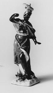 Donna nera con ombrellino giallo e veste turchina foderata di rosa. Sulla base, fiorellini a rilievo