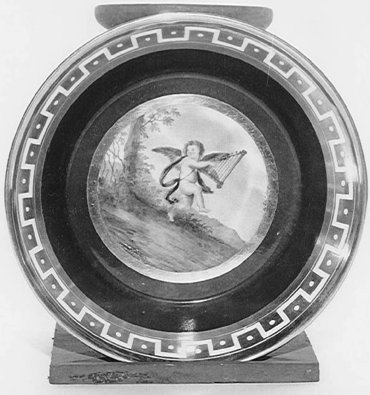 Piattino tronco-conico marrone e bordi oro a meandro; al centro, putto reggente un'arpa