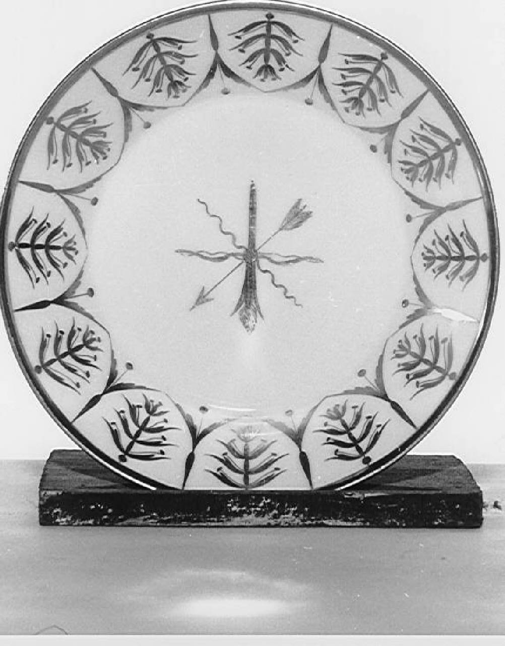 Piattino troncoconico. Porcellana bianca con fregi oro. \nPiattino con arco, freccia e face, incrociati e fregi in oro a motivi vegetali stilizzati
