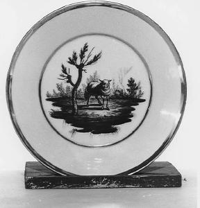 Piattino troncoconico con labbro dorato. Sul piattino, pecora in un prato al centro, e alberi a monocromo
