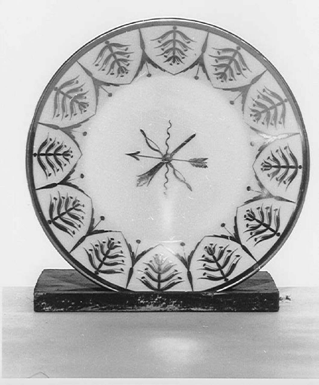 Piattino troncoconico.\nPorcellana bianca con bordi oro. Sul piattino: arco, freccia e face