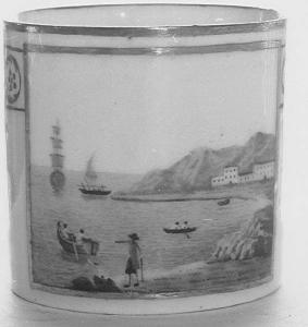 Tazzina di forma cilindrica con ansa. Bordo a semplice linea. Sulla tazzina, paesaggio a colori con navi e barche sul mare