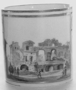 - NOTIZIE STORICO CRITICHE La marca "N" consente di riferire la tazza alla Reale Fabbrica di Porcellana di Napoli. La tazza presenta bordi a fili dorati e con un sottile fregio vegetale color rosso seppia. Tanto le dodici tazze cilindriche, quanto la zuccheriera presentano vedute del regno di Napoli, secondo un gusto ben noto all'interno della Manifattura, incorniciate da un sottile fregio vegetale color rosso seppia e da un bordino dorato. L'esemplare in esame riproduce le rovine dell'Anfiteatro di Benevento.\nL'esecuzione delle vedute, basate su di una stesura a macchia che contrasta con la pennellata puntiforme di Giacomo Milani, celebre decoratore attivo in quell'arco di tempo, ha portato A. Pacia (2011), cui si deve la valorizzazione del servizio, a posticipare la datazione, fissata da A. Mottola Molfino (1977) intorno al 1780, al decennio successivo.\n\nMarco Albertario
