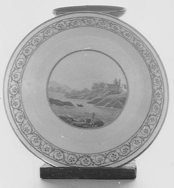 Piattini troncoconici. Lungo il bordo sono dipinti veticci color rosso. Sul piattino, paesaggio con veduta costiera e edificio religioso.