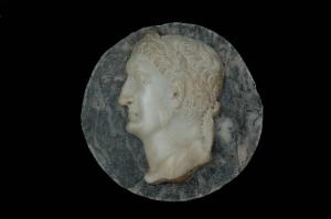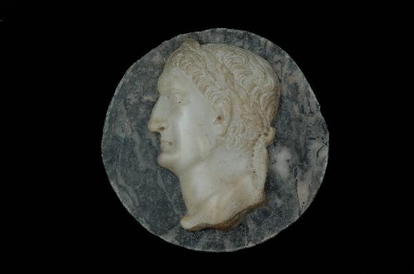 Rilievo di testa di imperatore romano laureato in marmo bianco di Carrara, applicato su disco in marmo grigio sommariamente sbozzato
