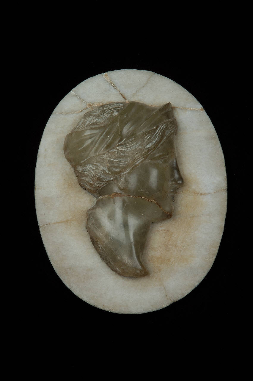 Rilievo in onice applicato su di un disco di forma ovale in marmo di Carrara