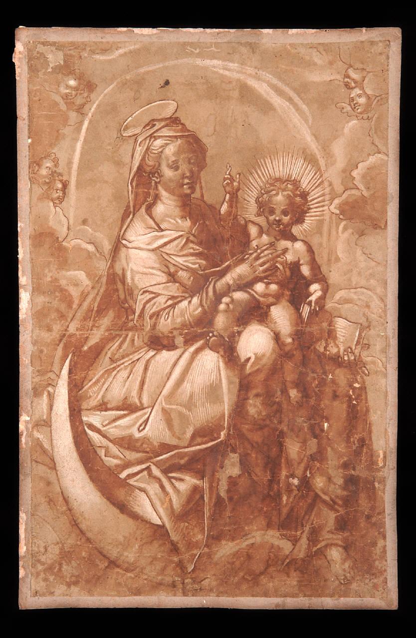 - NOTIZIE STORICO CRITICHE Il disegno è attribuito a Jacopo Ligozzi da C. L. Ragghianti (segnalazione in Corpus Graphicum 1970); il riferimento a Sabbatini si deve a comunicazionescritta di Stefano L'Occaso.\nConfronta L. Sabbatini, Madonna in gloria con San Pietro che consegna le chiavi a San Clemente e i santi Giacomo, Girolamo,Lorenzo e Stefano, 1569-1570 (v. D. Benati, in Pinacoteca di Brera. Scuola emiliana, Milano 1991, a cura di F. Zeri, Milano 1991, pp. 250-252 n. 129). \nIn relazione al dipinto va considerato un disegno della National Gallery of Canada a Ottawa (inv. 293) che presenta una Madonna con il Bambino sulle nubi in gloria d'angeli identica a questa, salvo che per la diversa inclinazione del capo e la presenza della falce di luna: due dettagli grazie al quale il soggetto diventa autonomo. \nCome tale è inciso da Agostino Carracci intorno al 1579, e poi ancora da un secondo autore (forse Domenico Tibaldi) nel 1575. Cfr. D. De Grazia, Le stampe dei Carracci con i disegni, le incisioni, le copie e i dipinti connessi, Bologna 1984, p. 80, n, 15 e figg. 15, 15a,316, dove si segnala un'altra versione del disegno, non autografo, che probabilmente coincide con l'esemplare in esame (B 67). \nM. Albertario