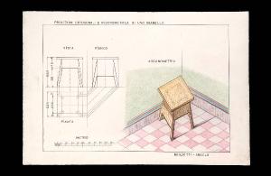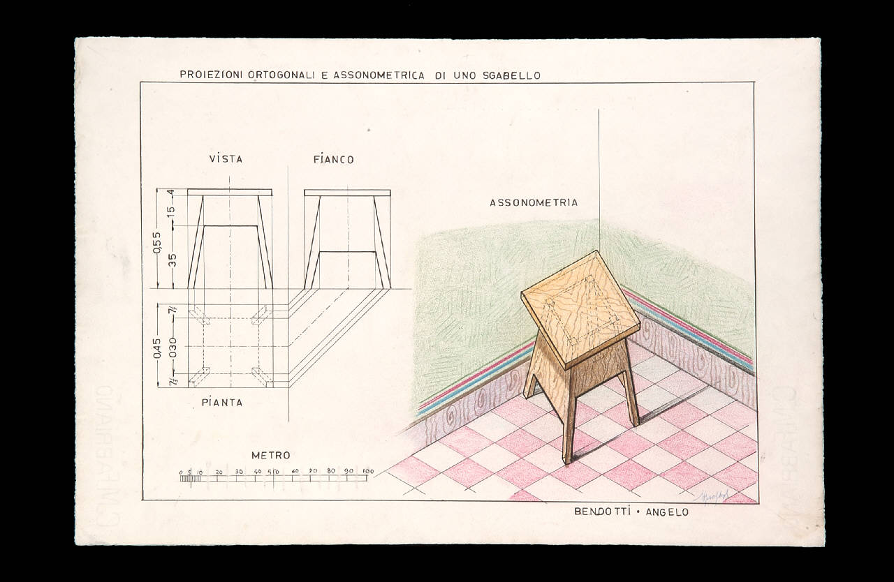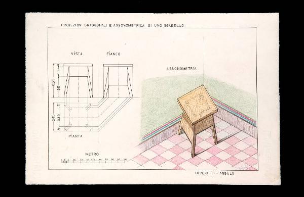 Proiezioni ortogonali e assonometrica di uno sgabello. Sgabello con proiezioni e assonometria