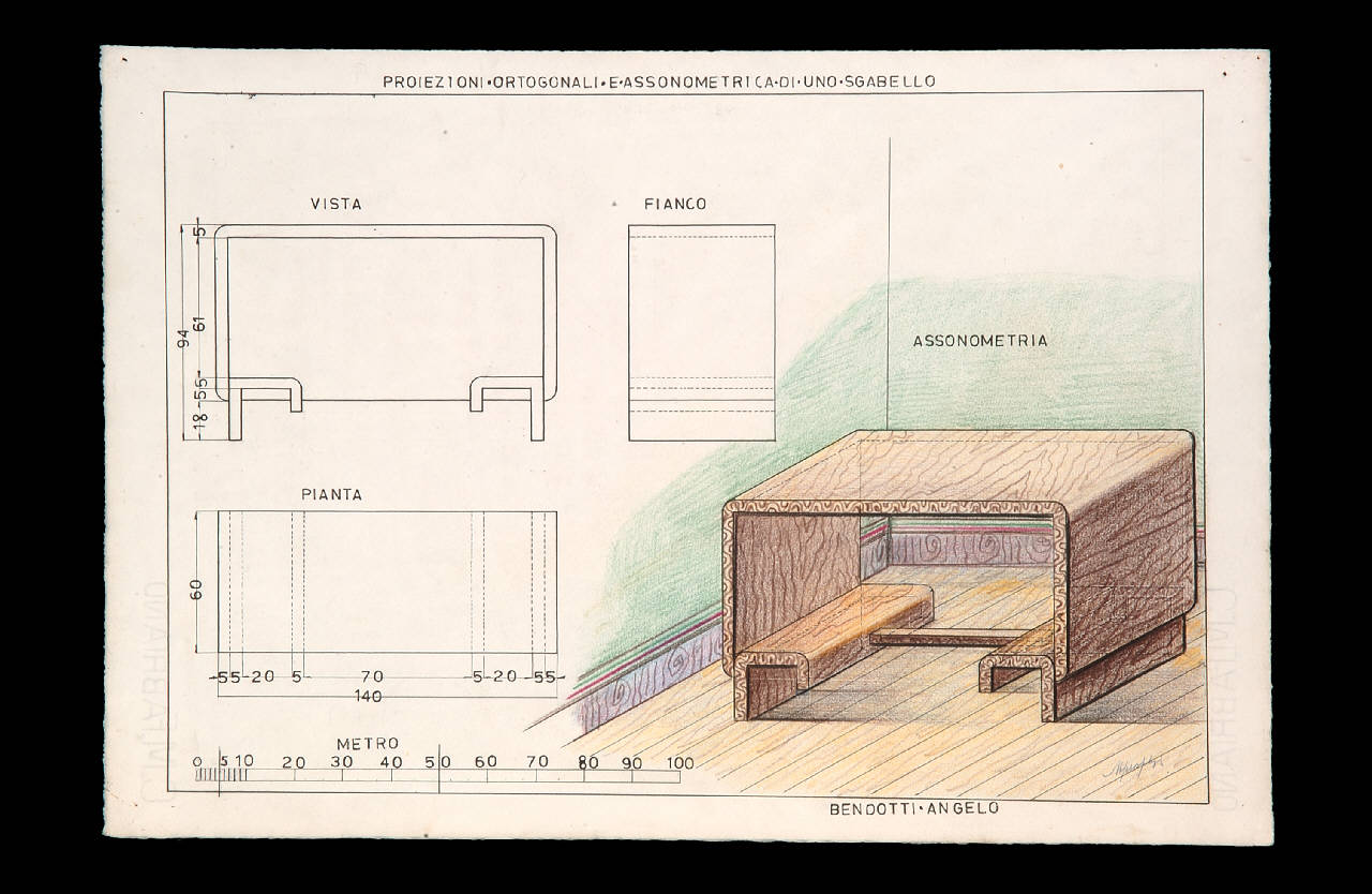 Proiezioni ortogonali e assonometrica di uno sgabello. Sgabello con proiezioni e assonometria